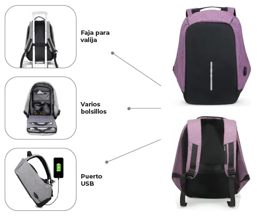 - Puerto USB externo: conecta tu powerbank desde el interior y carga tu celular o dispositivos sin necesidad de abrir la mochila.
